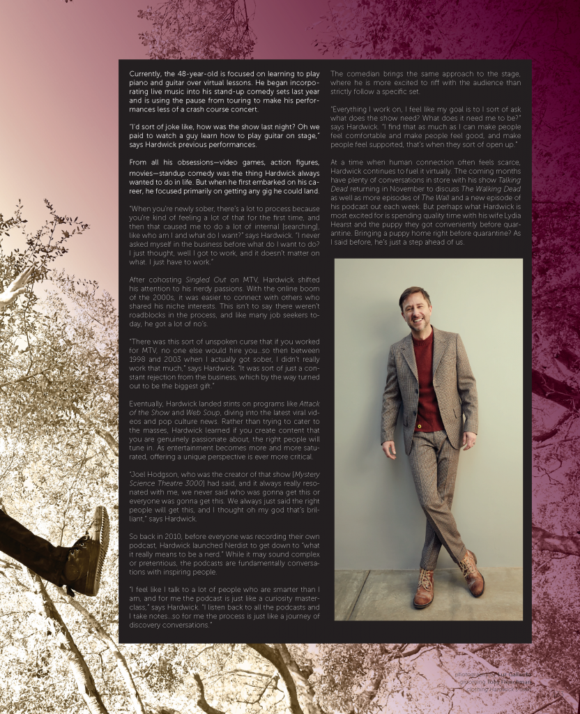 For Hardwick the answer is yes. The comedian, podcaster, TV host and champion of nerd culture has always been ahead of the masses. Though for many of us it took a pandemic to slow down, invest in hobbies and consider what actually makes us happy, Hardwick ignited his self-discovery years ago. He credits Jon Stewart for giving him his wakeup call during a dis on The Daily Show, prompting him to look at his life and realize drowning in booze in a crappy apartment wasn’t his dream. So he stripped away distractions and applied his key strengths as a self-described nerd—obsession and direction—to build the life he truly wanted.