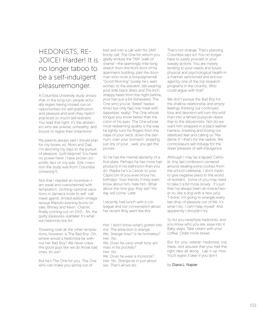 But he’s The One for you. The One who can make you spring out of bed and into a cab with his 2AM booty call. The One for whom you gladly endure the 7AM “walk of shame”—the seemingly mile-long stretch from the front door of his apartment building, past the doorman who nods a nonjudgmental “Good Morning” (surely he’s seen worse), to the elevator, still wearing your little black dress and 3½-inch strappy heels from the night before, your hair just a bit disheveled. The One who you’ve “dated” twelve times but only had one meal with (appetizer, really). The One whose tongue you know better than the color of his eyes. The One whose most redeeming quality is the way he lightly runs his fingers from the nape of your neck, down the sternum, over your stomach, stopping just shy of your… well, you get the picture.