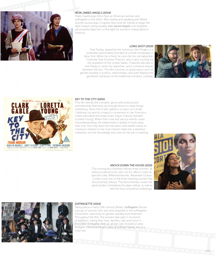 In this Oscar award-winning film, Meryl Streep is Margaret Thatcher, once prime minister of England who is ridding herself of her deceased husbands’ belongings with the help of his ghostly presence. As a result, Thatcher finds herself reflecting on her girlhood and her political life as a woman. Thatcher was a feminist pioneer in that she paved the way for British women to hold office, as well as prove that women can be just as successful in politics as men.