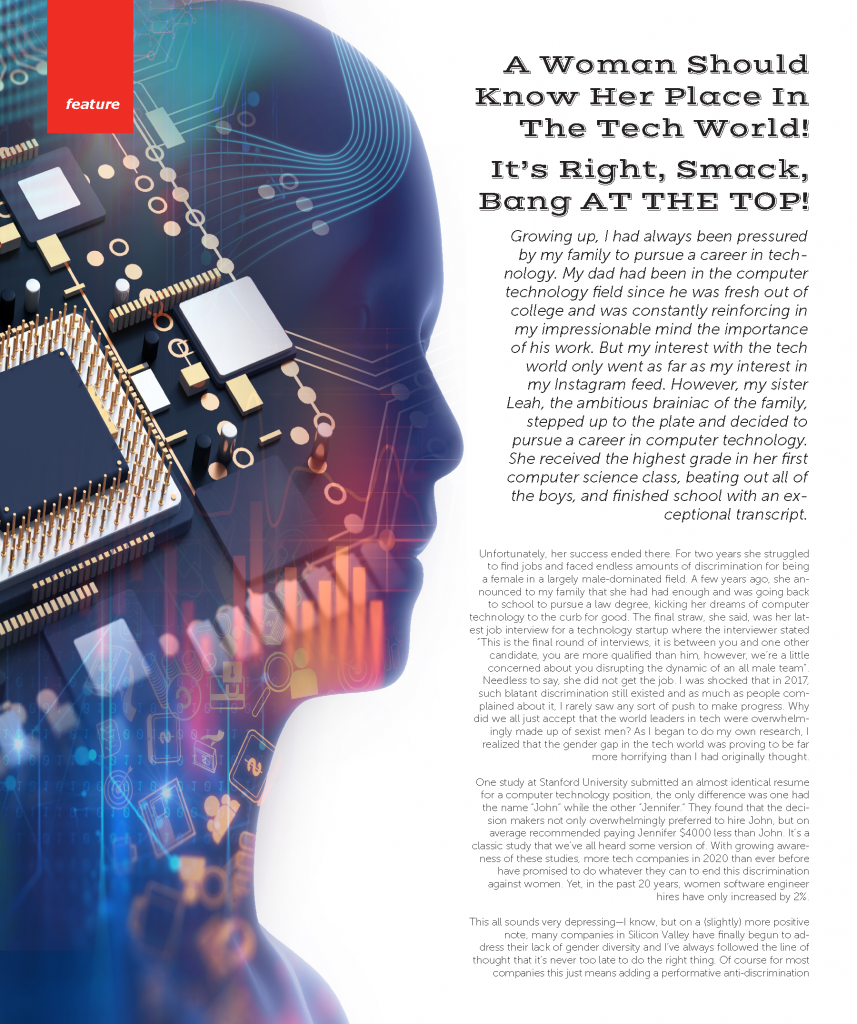 Unfortunately, her success ended there. For two years she struggled to find jobs and faced endless amounts of discrimination for being a female in a largely male-dominated field. A few years ago, she announced to my family that she had had enough and was going back to school to pursue a law degree, kicking her dreams of computer technology to the curb for good. The final straw, she said, was her latest job interview for a technology startup where the interviewer stated “This is the final round of interviews, it is between you and one other candidate, you are more qualified than him, however, we’re a little concerned about you disrupting the dynamic of an all male team”. Needless to say, she did not get the job. I was shocked that in 2017, such blatant discrimination still existed and as much as people complained about it, I rarely saw any sort of push to make progress. Why did we all just accept that the world leaders in tech were overwhelmingly made up of sexist men? As I began to do my own research, I realized that the gender gap in the tech world was proving to be far more horrifying than I had originally thought.